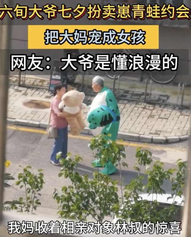 適逢七夕情人節,北京一名六十多歲的大叔為博取心儀對象開心,裝扮成青蛙在街頭等待對方,並用各種搞怪的表情和動作逗她開心。充滿「粉紅泡泡」的一幕,被女方女兒拍下上傳到網路,引起網友讚賞,果然不管什麼年紀用心就會有浪漫。