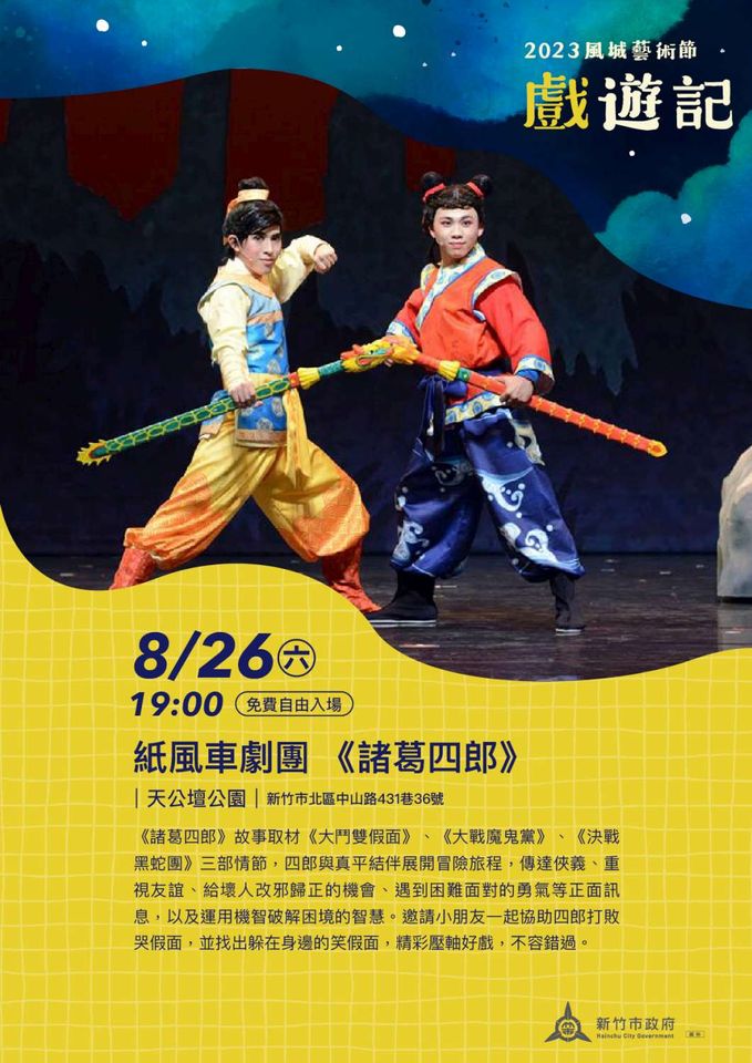 新竹市2023風城藝術節系列活動壓軸場,8月26日晚間7點將在天公壇公園(中山路431巷36號)登場!由紙風車劇團盛大演出《諸葛四郎》兒童劇,改編自台灣經典漫畫英雄、串起三代情的精采故事,整場演出高潮迭起,是暑期不容錯過的精采好戲。市府表示,活動免費入場,大會服務台將發送互動面具,數量有限、送完為止,歡迎市民闔家共享熱鬧歡樂的夏日夜晚。
