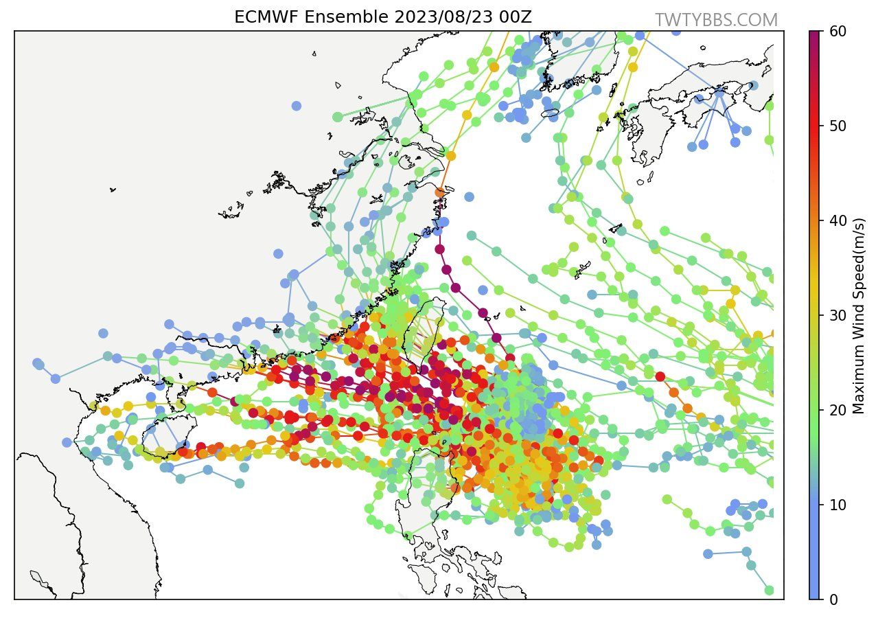 臉書粉專台灣颱風論壇|天氣特急表示,最新的歐洲數值模式顯示,模式小成員非常發散,熱帶系統路徑不確定性很高,極度貼近台灣機率大約30%左右,另一個值得關注的是,熱帶系統強度不會太弱,會滿厲害的。