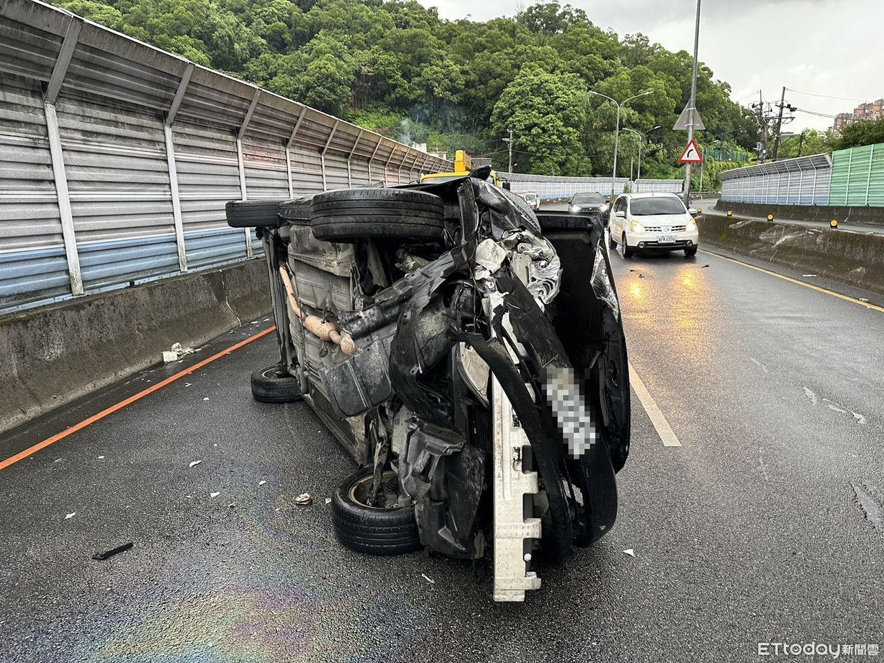 ▲邱男擦撞護欄後翻車,受困車內由民眾救出。(圖/記者陸運陞翻攝)