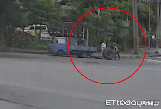 ▲500公斤重卡車輪胎掉路邊,父子黨「1分鐘偷走」。(圖/記者賴文萱翻攝)