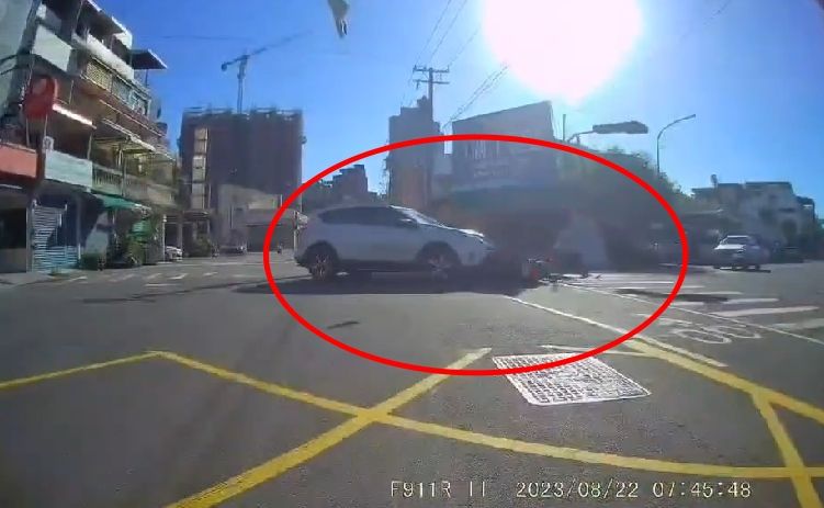 有網友上傳一段車禍事故影片,畫面清楚錄下,一部直行機車遭對向的左轉休旅車攔腰撞上,騎士當場被撞飛,機車車殼四散,機車車體則卡在休旅車車頭下,車禍發生後,肇事的休旅車仍繼續踩油門,推著機車往前開了15秒、約20公尺,讓一旁的騎士嚇壞,因為不清楚男騎士是否有卡在車底,急忙追上並按喇叭示意女駕駛停車。