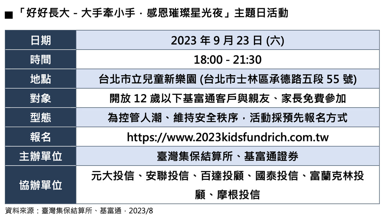 教育是孩子的未來,但如何籌措教育費用,讓許多爸媽一個頭兩個大。為解決家長困擾,臺灣集中保管結算所、基富通證券與6大基金公司,9月23日晚上將於兒童新樂園舉辦「好好長大-大手牽小手.感恩璀璨星光夜」活動,邀請全台爸媽帶著12歲以下小朋友,及家扶基金會扶助家庭,以寓教於樂方式一起公益做愛心、同樂學理財。