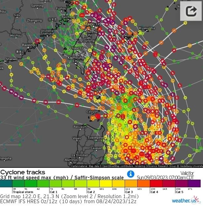 氣象粉專「觀氣象看天氣」今指出,歐洲中期天氣預報中心對蘇拉颱風最新的電腦系集預測模式,路徑南起巴士海峽,北至台灣北部海面,平均路徑穿越台灣;強度的部份,來到台灣東方海面時可達強烈颱風等級。接下來路徑還會有所調整,持續密切追蹤。