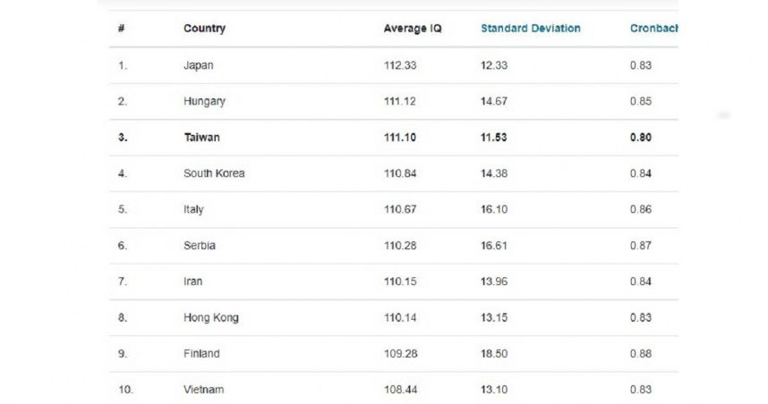 根據去年2022年「Wiqtcom」所公布的智商測試結果,台灣平均智商116.07排名第1,第2名是日本的112.69,第3名則為匈牙利的111.42。