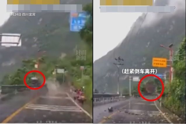 四川宜賓一名男子開車上班途中,行經山邊公路時,目睹巨大落石從山上滾落,差點砸中他的車子,嚇得他立刻倒車,沒想到過程中又遇到2次落石,每顆石頭都掉落在他剛經過的地方,只要晚一秒後果不堪設想,也讓他自嘲根本是「現實版死裡逃生」。