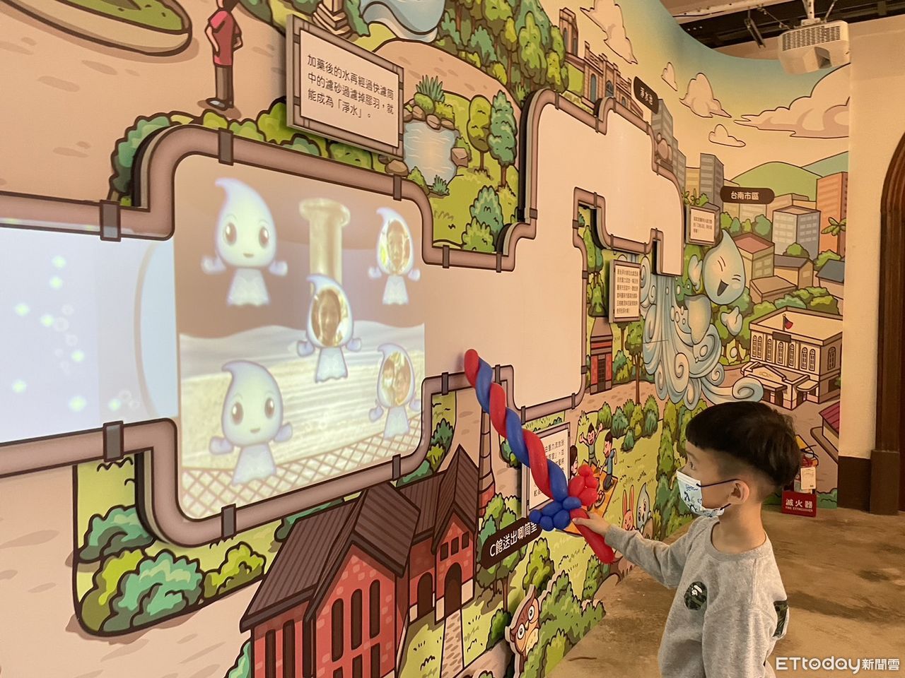 ▲台南市文化局在山上花園水道博物館C館(送出唧筒室),導入AR科技,規劃互動投影劇場「水旅程–水太郎的秘密基地」,讓民眾化身為可愛的水滴寶寶「水太郎」,體驗從原水變成淨水的旅程。(圖/記者林東良翻攝,下同)