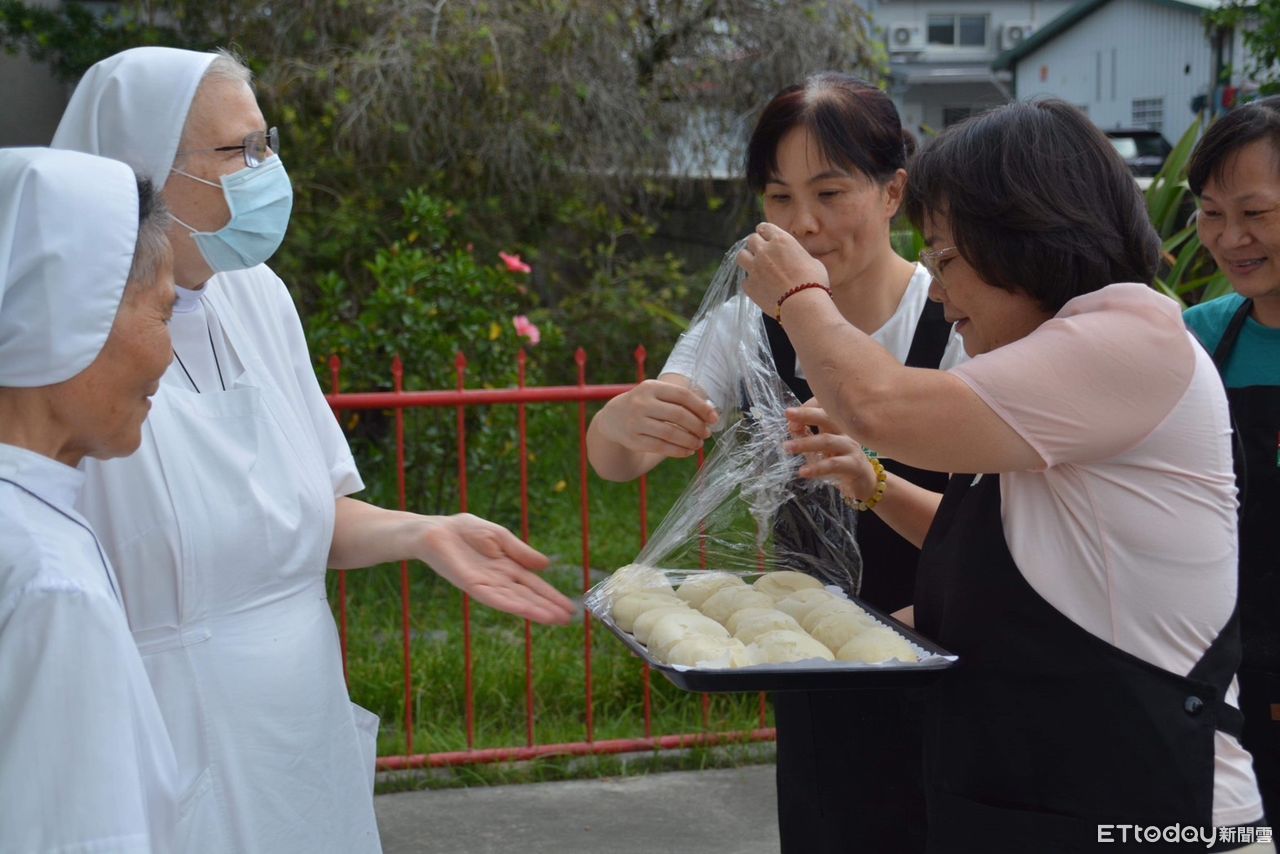 假日許多媽媽帶著小孩報名參加學做綠豆椪,每個動作耐心的陪伴教導,眼睛還得緊盯頭上大螢幕老師的說明。辛苦終於等到成果盼到烤箱出爐的那一刻,邱美玲帶著同仁送上自己動手做的綠豆椪來到聖十字架療養院,雖然離中秋節還有一個多月,邱美玲笑說關山鎮農會「搶頭香」要讓修女們和院民感受小鎮的溫暖。高德蘭院長和裴彩雲外國修女代表接受,剛出爐散發出誘人的餅皮香氣眾人拱修女們嚐鮮,果然綠豆椪的美味也得到認證。