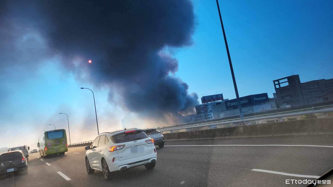 ▲傢俱工廠起火,焦黑濃煙也影響國道1號五股段。(圖/記者田暐瑋攝,下同)
