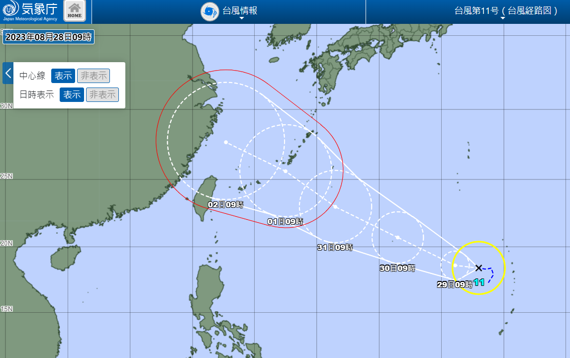 目前海面上共有三個颱風,分別是九號颱風蘇拉、十號颱風丹瑞、十一號颱風海葵。沖繩與奄美受到海葵與蘇拉颱風的影響,周三至周六(8月30日至9月2日)可能出現大風大雨。