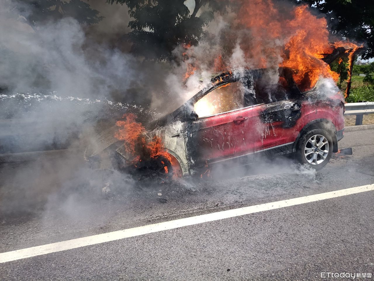 國道一號北上286K,28日下午1時33分許,驚傳火燒車事件,1部紅色自小客車行駛中,不明原因車頭冒白煙,經停靠路肩時發現引擎室已起火燃燒,台南市消防局119勤務中心據報,出動新營分隊4車8人前搶救,消防人員到場時,車子已全面燃燒,消防人員經接駁水帶射水搶救,火勢於10分鐘內撲滅,但該紅色自小客車全毀,初步調查該車係2015年份的車子,起火原因及財物損失由消防局調查處理中。