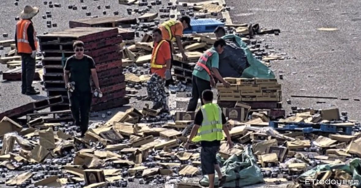 ▲國1今日14時許傳出裝載大量罐裝咖啡的貨車散落。(圖/翻攝高速公路1968,下同)