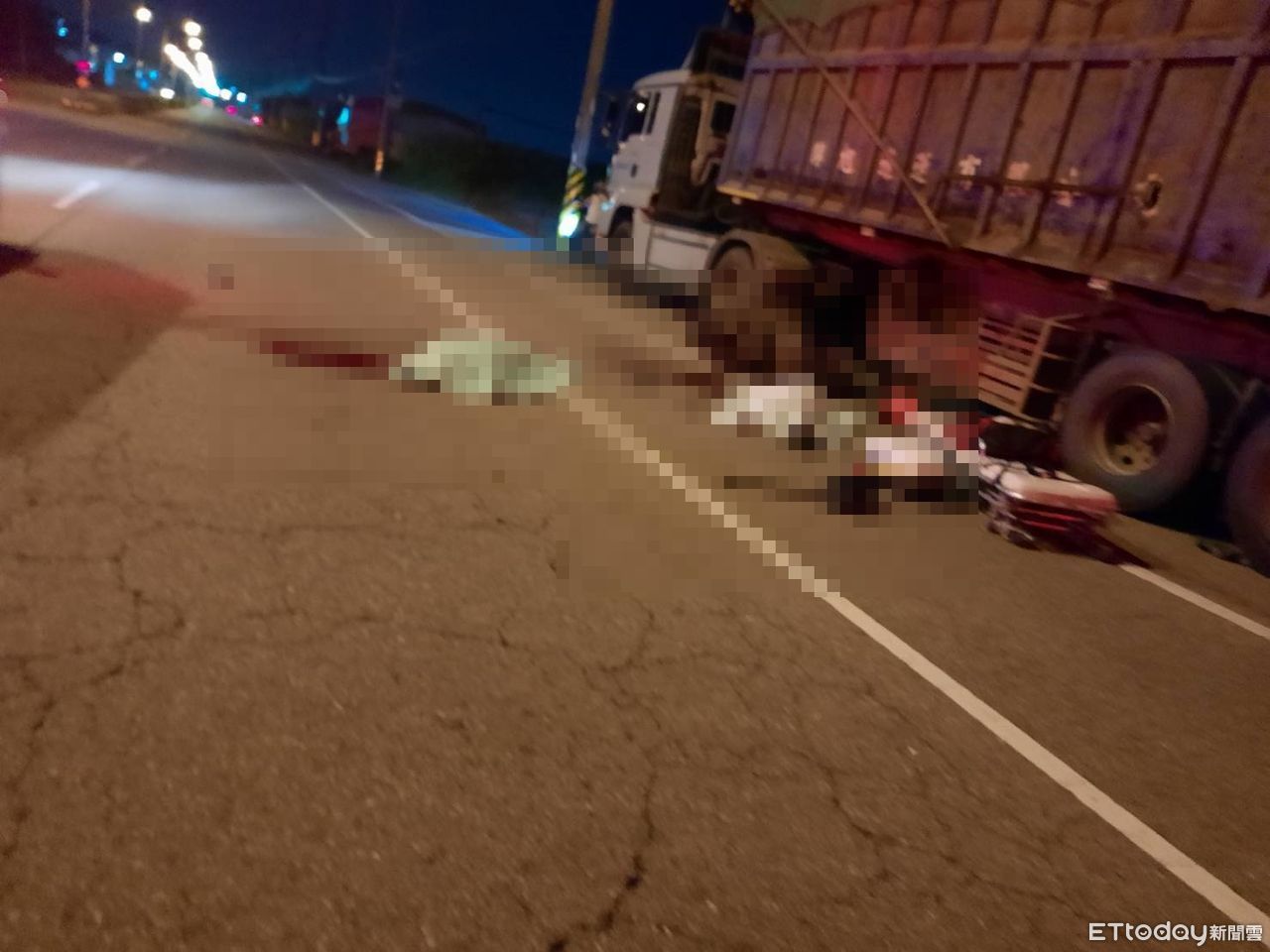 ▲苗栗28日晚間發生「機車撞路邊大貨車」事故,造成1男1女死亡。(圖/記者蔡文淵攝/下同)