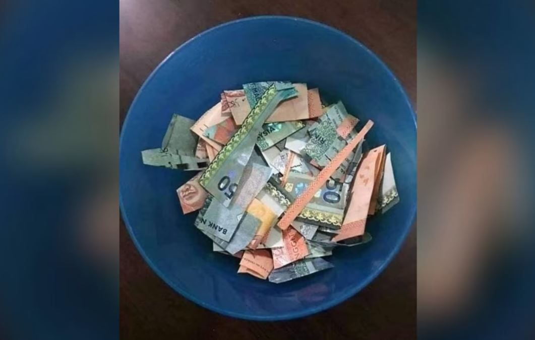 根據《星洲網》報導,馬來西亞一名女網友「Manja Juwita」在臉書上po出一張「滿盆碎鈔」的照片。她寫道,家裡的一名小孩放暑假在家玩耍,沒想到卻趁大人不注意,將阿公放在家中的退休金現金剪碎。