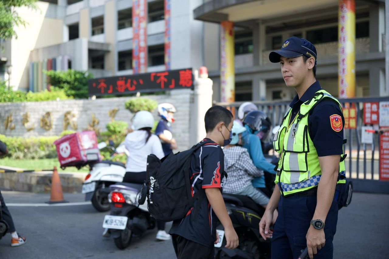 ▲高顏值員警在校門前指揮交通。(圖/翻攝自臉書/TCPB 局長室,下同)