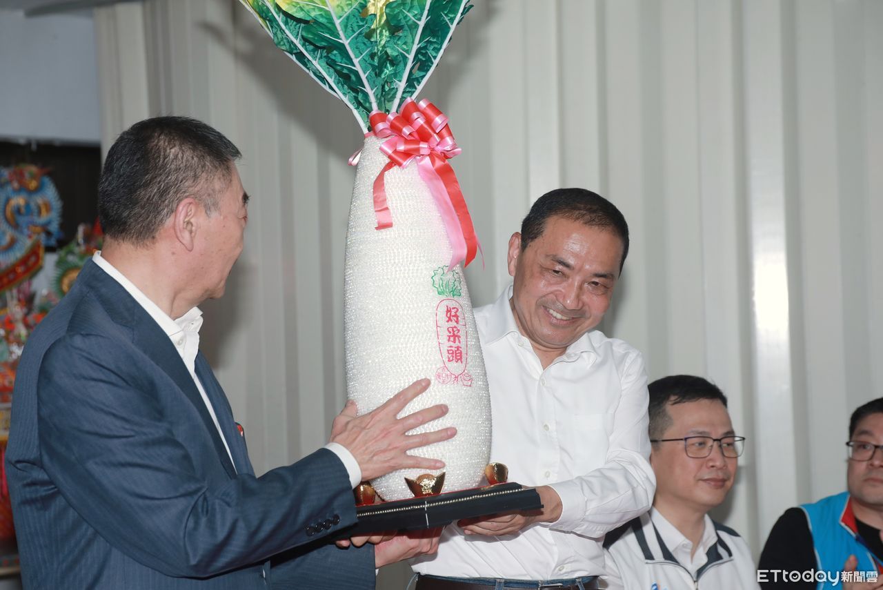 ▲侯友宜與大安區里長茶敘座談,陳錦祥送上好彩頭。(圖/記者周宸亘攝)