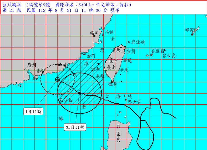 氣象局表示,若此颱風行徑無特殊變化,本局預計於今(31)日14時30分解除海上颱風警報。