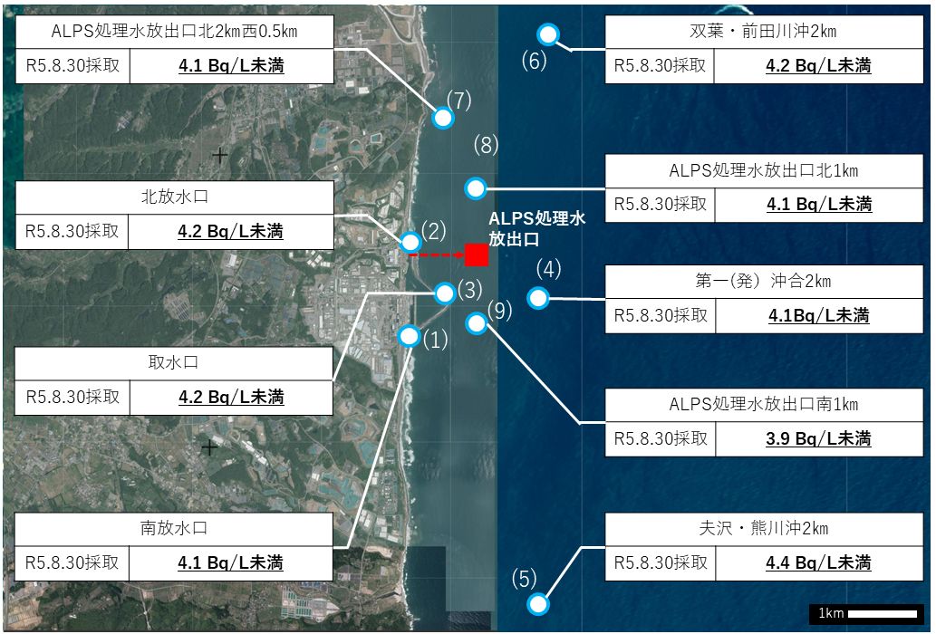 綜合福島電視台(FTV)及《共同社》,福島縣為監測福島第一核電廠排放核處理水對海水的影響,8月30日在排水口附近至2公里內近海的9個定點採集海水獨立分析,1日在官網公布結果指出,各觀測點氚含量皆低於每公升10貝克標準,落在3.9至4.4貝克之間。