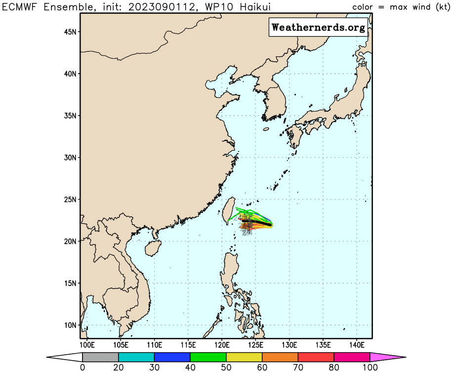 最新(1日20時)歐洲(ECMWF)模式模擬顯示,「海葵」的系集路徑非常分散,代表「不確定性」很高,其中包括不少在台灣附近迴轉的模擬,不可忽視,應密切觀察。