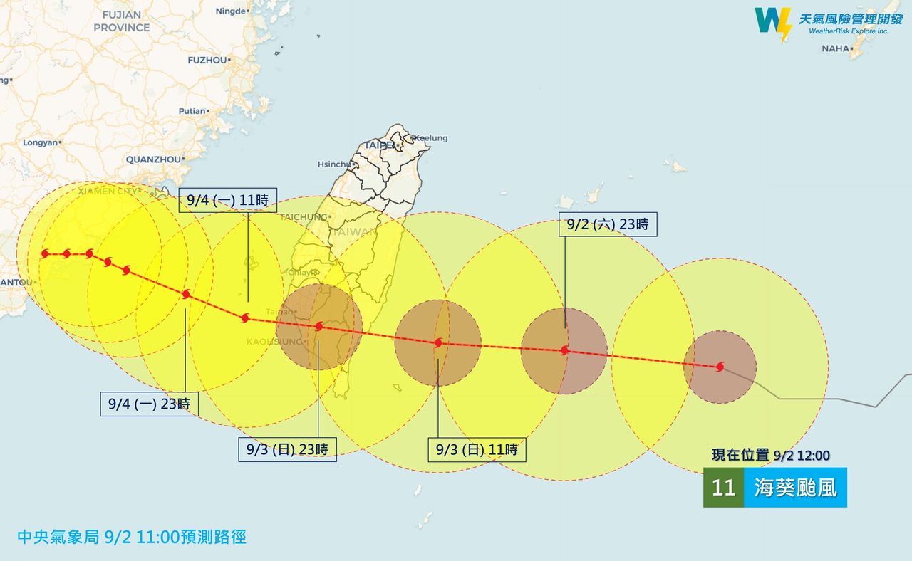 海葵颱風陸警發布,天氣風險公司指出,今(2日)下午竹苗以南地區將列入陸上警戒的範圍,明天(3日)晚間登陸台東機率高;好消息是,原本預測下周到下周三前將「滯留」台灣海峽南部,但最新預測海葵僅是「放慢速度」朝中國前進,颱風影響期程可望縮短,最快下周二(5日)將解除颱風警報。