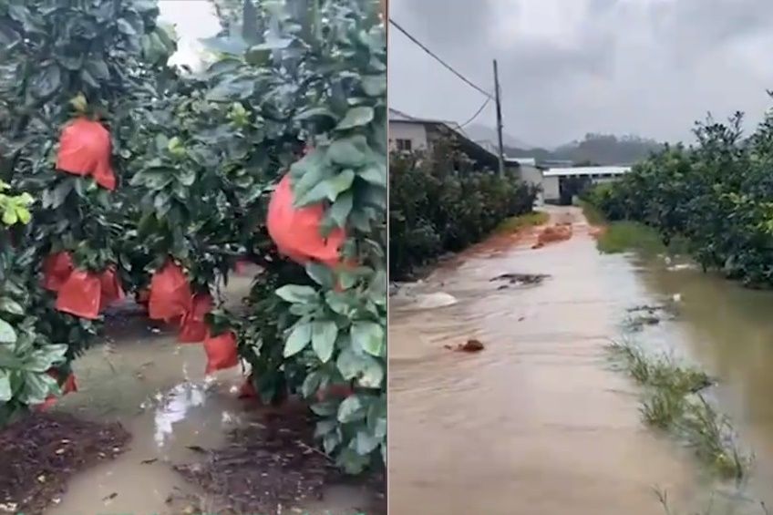 ▲大水灌進農地,柚子樹也慘遭殃。(圖/翻攝自影片)