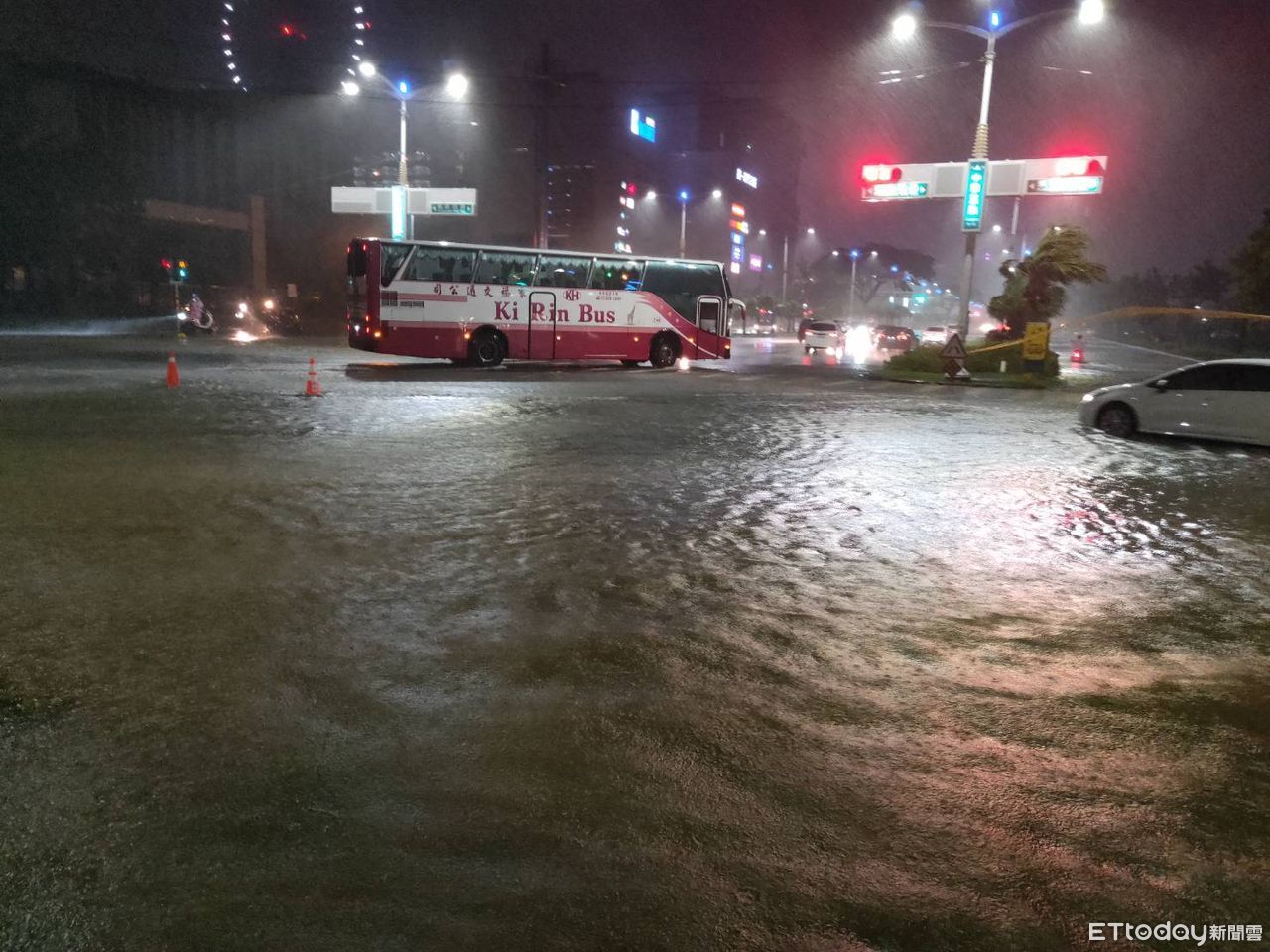 在前鎮區凱旋四路、中華五路口,夢時代百貨附近則發生嚴重積淹水情形,員警也趕赴現場協助拉起封鎖線及交通管制,請用路人提前改道行駛,並呼籲駕駛人切勿強行通過積淹水區域,以確保自身安全。