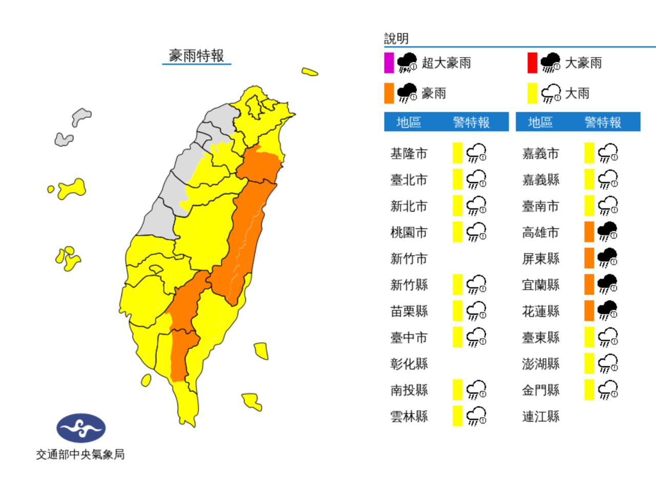 大雨:基隆北海岸、臺北市、新北市、桃園市山區、新竹縣山區、苗栗縣山區、臺中市山區、南投縣、雲林縣、嘉義市、嘉義縣、臺南市、高雄市、屏東縣、恆春半島、宜蘭縣、臺東縣、蘭嶼綠島、澎湖縣、金門地區