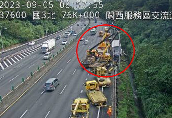 高公局表示,今天6時27分,國道3號北向76K、關西服務區交流道路段,發生一輛大貨車撞外護欄衝出邊坡事故,拖吊處理中,佔用外2線車道,無回堵,目前成立緊急應變小組積極處理。