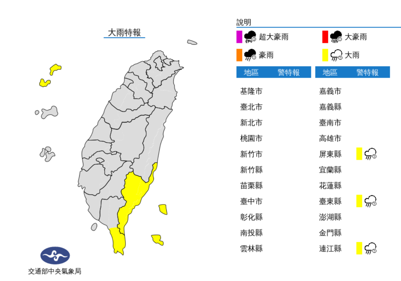 大雨:恆春半島、台東縣、蘭嶼綠島、馬祖地區