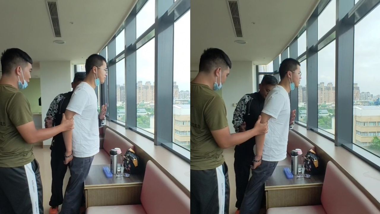 這段影片當中,只見秦良丰在同袍的保護下,雙腳緊靠著貼著牆面的茶几,緩滿的往前傾斜,還聽到他問是不是有45度了,不過旁邊的人告訴他是60度,還提醒他45度太斜了,可是秦良丰聽完了之後,沒有停止傾斜,又繼續緩慢的往前,似乎已經到達目前他能做的極限,只好無奈放棄,挺直身子,旁邊的人還是鼓勵他「60度已經不錯了」。