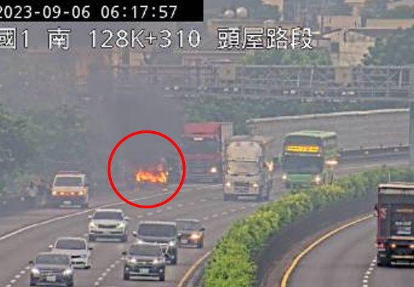 ▲現場畫面。(圖/翻攝高公局網站/下同)記者陳俊宏/綜合報導上班注意!高公局表示,今天6時6分,國道1號北向129K、頭屋路段,一輛小客車起火事故占外路肩,請用路人小心行駛。