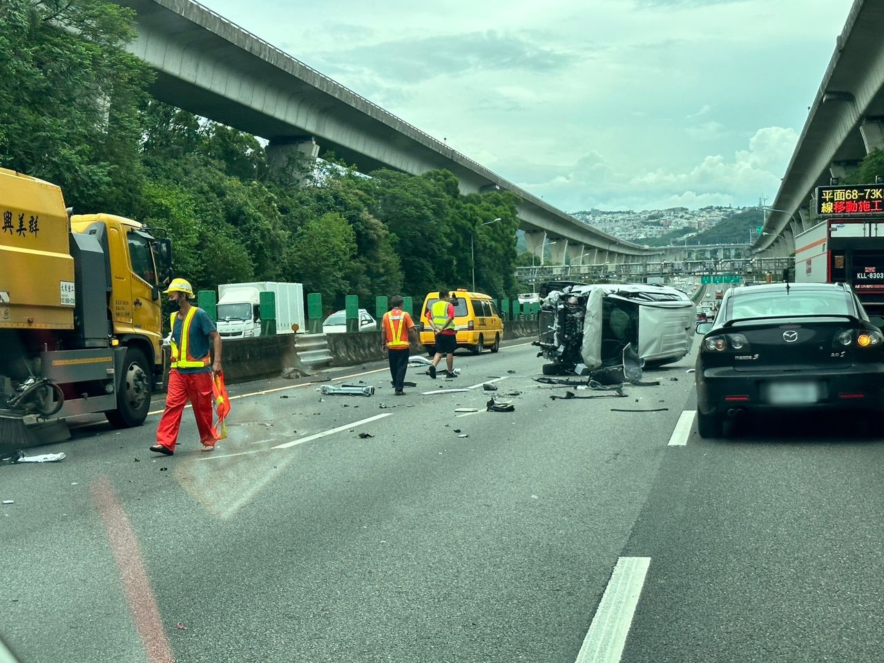 國道1號南下68.5公里處7日中午12時50分發生一起車禍!一輛自小客車因不明原因撞上高公局委外施工廠商的緩撞車,由於撞擊力道猛烈,小客車當場翻覆,車內安全氣囊爆開,車頭全毀,現場一地都是車殼碎片。