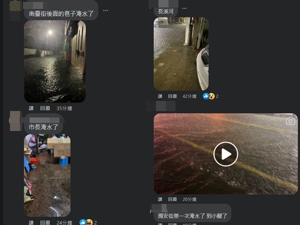 網友紛紛到黃偉哲臉書PO出淹水的災情,「國安街第一次淹水了,到小腿了」、「長溪河」、「新光三越新天地後面,永福路馬路小淹水了」、「樹林街附近全家淹大水」、「南臺街後面的巷子淹水了」,也有網友向市長喊話「趕快想辦法處理,市長」、「放假吧」。