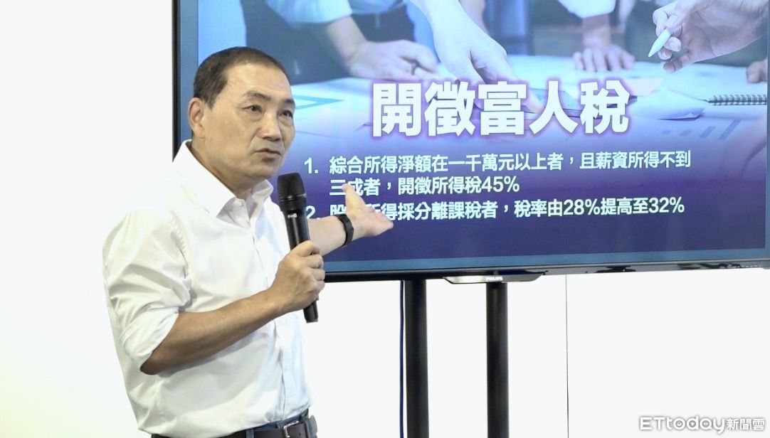 「富人稅一定要增加,該做的公平正義就是該做」侯友宜說,綜合所得淨額在1000萬元以上者、薪資所得占比不到三成,開徵所得稅45%,股利所得採分離課稅者稅率從28%調升到32%,開徵富人稅,落實公平正義,縮短貧富差距。