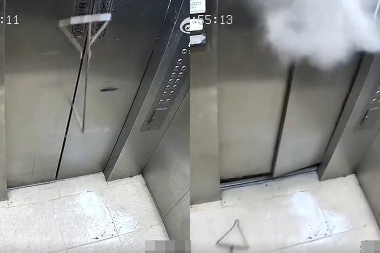 甘肅武威一名女子日前走出電梯後,不希望電梯太快關門,因此拿鐵架擋在門中間,然而電梯並未偵測到異常,反而夾著鐵架一起上升,最後卡住發生爆炸,冒出陣陣白煙,也造成整個電梯門變形,鐵架被夾斷,維修費用需3000多元(人民幣,下同,約新台幣13000元)。