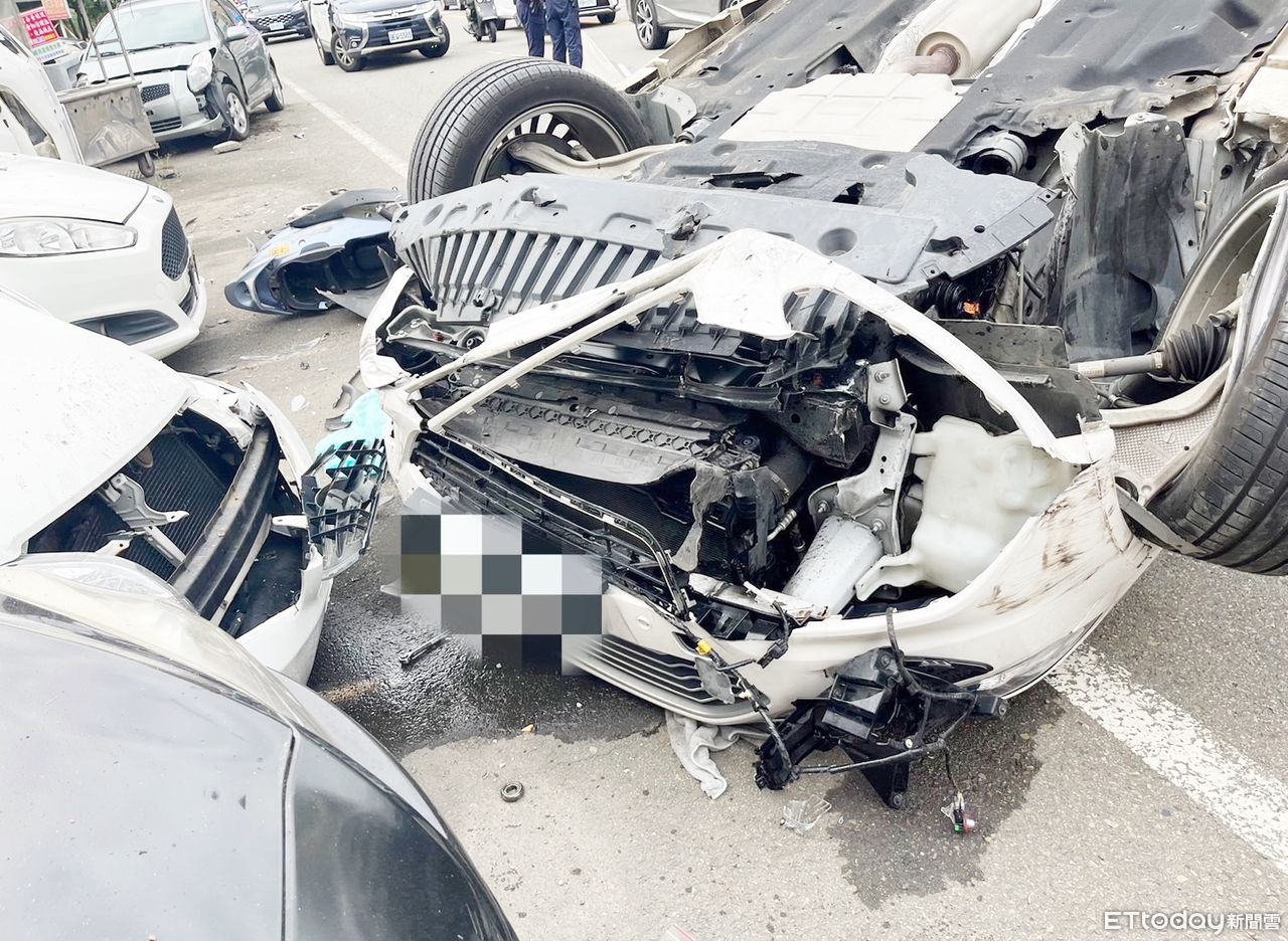▲桃園市82歲紀姓老翁今天清晨駕車行經八德區介壽路二段附近時疑似闖紅燈,撞上機車後翻覆還波及路旁4輛轎車。(圖/記者沈繼昌翻攝)