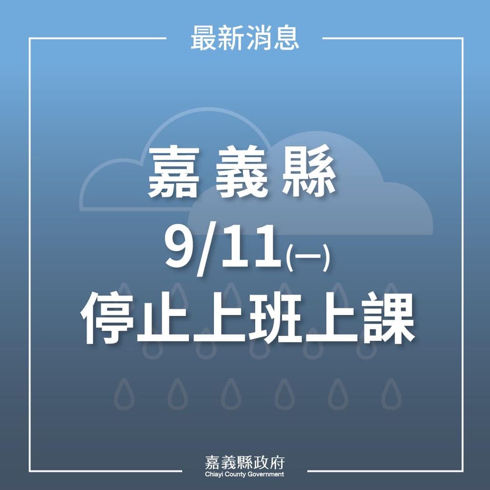 翁章梁發文表示,因10日豪雨造成本縣逾半數鄉鎮市有淹水災情,且各主要聯絡道路亦有交通中斷情事,為利後續災害搶救及復原,並為確保民眾往來通行安全,嘉義縣明日(9/11)停止上班停止上課,請鄉親務必注意安全減少外出。,翁章梁還在PO文留言強調是「全縣」停班課。