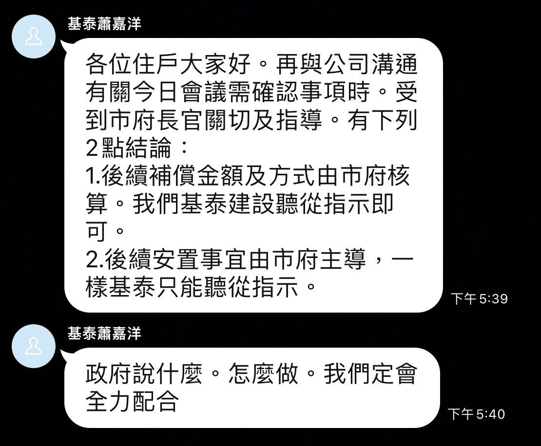 柳采葳轉述,原本會中談到包含租金補償等,住戶也提到補償細節,包含租金計算方式,以及給予方式,現場基泰蕭姓經理針對細節無法回答的部分,承諾晚上之前一定給予回覆,還強調基泰很有誠意、3小時內會給予答案,結果大家等到的是「受到市府長官關切及指導,後續補償金額由市府核算,安置事實也由市府主導」,也讓人質疑是否又要甩鍋?