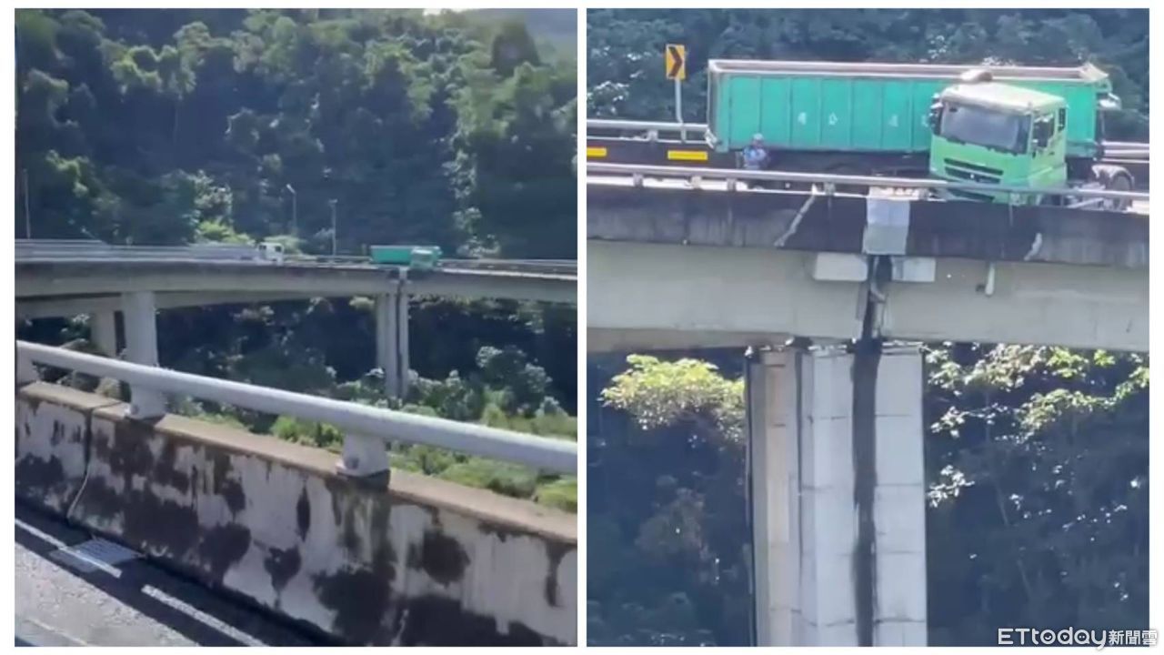 當時有同向的用路人也被迫停在環形匝道的事故點對面,等待前方事故處理,並拍下現場狀況:「折甘蔗」的車頭完全與車身逆向,正下方就是長長橋柱和滿布地面的綠色樹叢,畫面相當驚悚,若撞擊力道更大而衝出橋面墜橋,後果恐不堪設想。