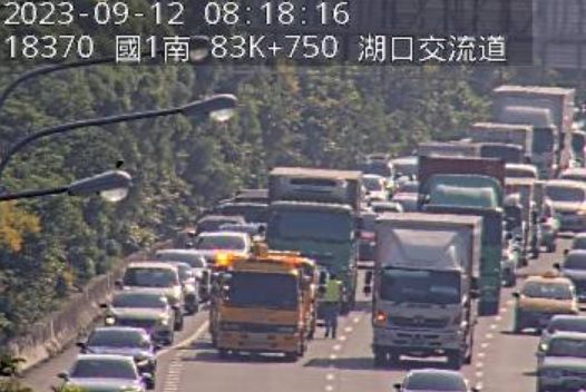 國道1號南向83.1K、新竹湖口交流道處今(12日)上午7時47分許發生事故,現場一輛大貨車與3部自小車追撞,佔用外線車道,受到事故影響,後方車流回堵約5公里,籲請用路人小心駕駛。