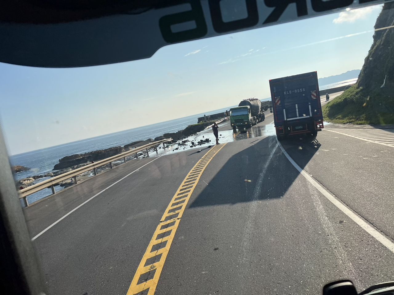 ▲台2線濱海公路水湳洞段,化學槽車衝出護欄卡在消波塊旁。(圖/翻攝記者爆料網)