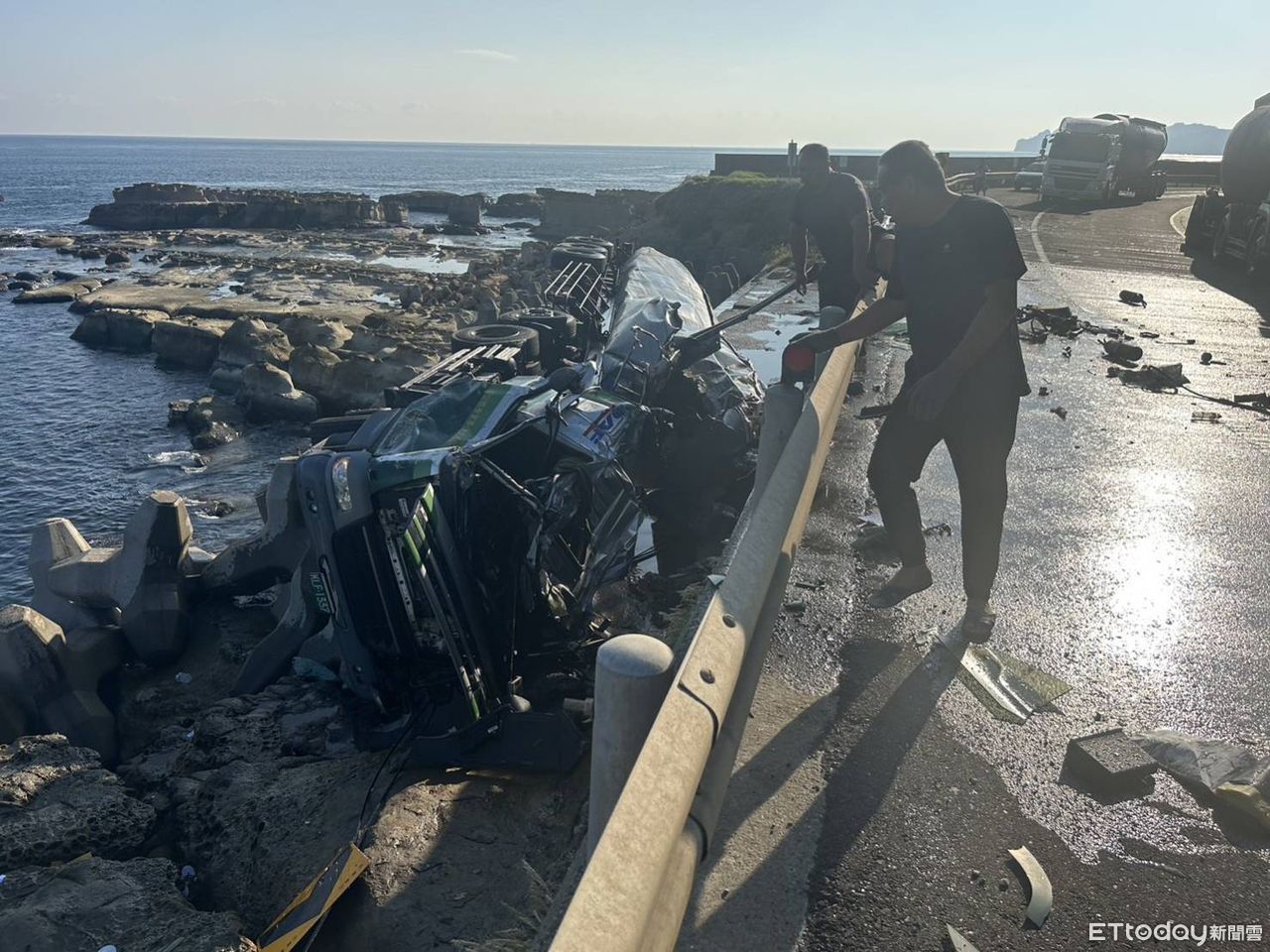 今(12)日早上7時許,一輛化學槽車行經新北市瑞芳區台2線濱海公路時,不明原因衝出護欄倒在岸邊消波塊旁,車上載的液態氯化鈣雖無毒但有腐蝕性,因事故而外洩,受困男駕駛救出後送醫仍不治身亡。