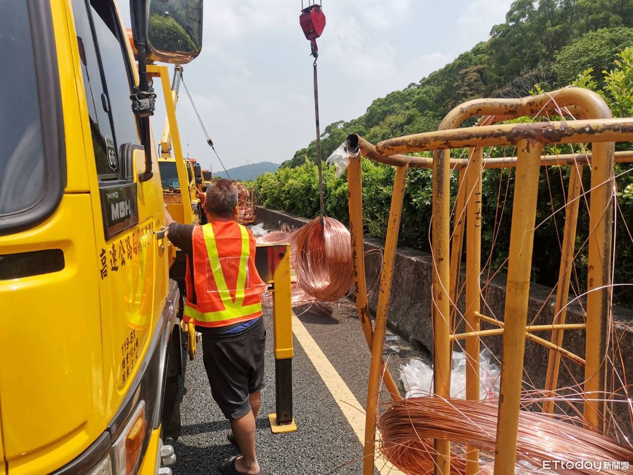 這起案件發生在今天中午11時許,一輛營業用半聯結車裝載銅線及銅管多捆,但卻因未捆紮牢固,車輛行經事故路段時,大量銅線滾落至內側車道,又滾至路肩。