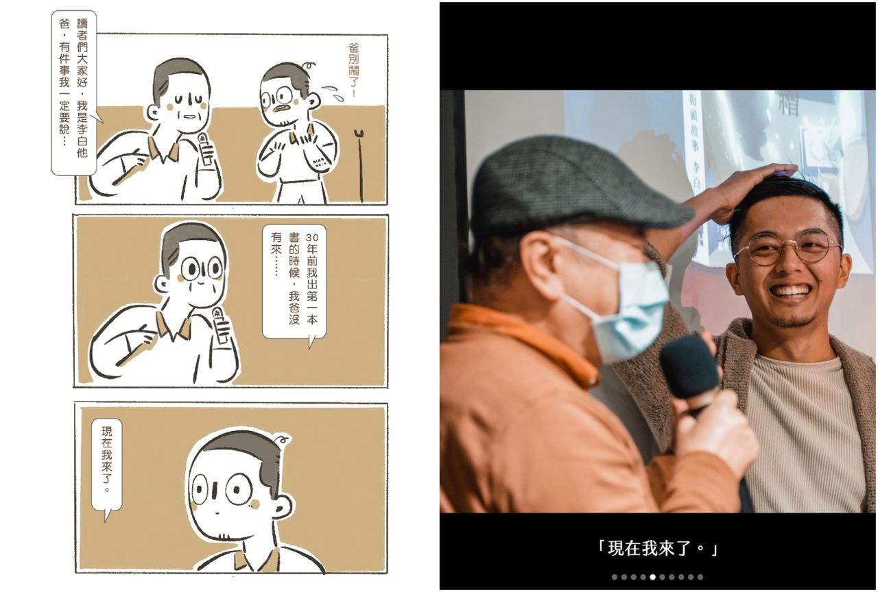 家人支持你的夢想嗎?IG擁有20萬粉追蹤的「街頭故事」圖文創作者李白分享,某次在新書發表會上,他的爸爸突然舉手上台,搶走他的麥克風說道,「30年前我出第一本書的時候,我爸沒有來⋯現在我來了。」他將這段回憶畫成漫畫,也收錄在新書並在IG跟讀者分享,讓許多網友看了紛紛按讚留言「直接噴淚!」、「眼淚流不停啦!」
