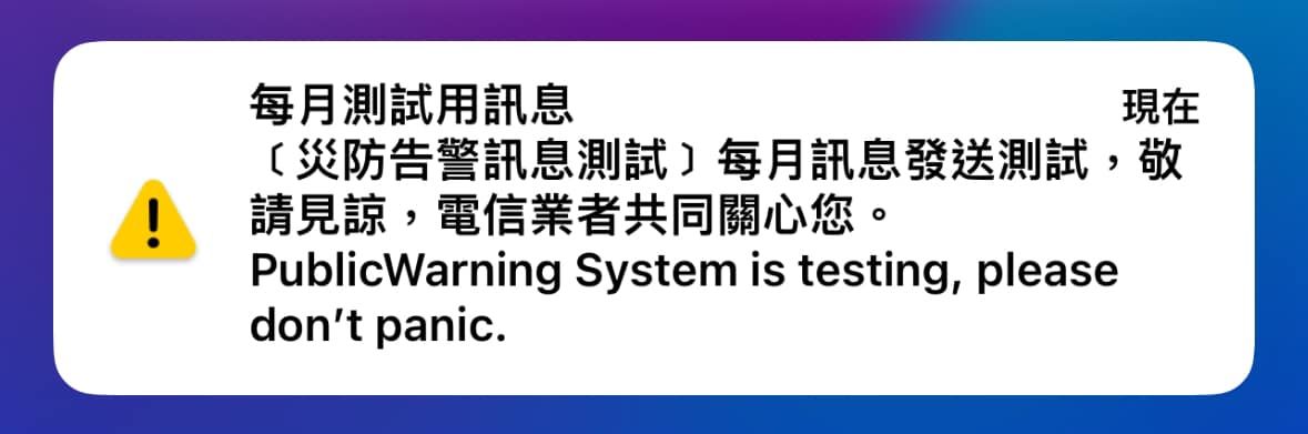 5大電信(中華電信、台灣大哥大、遠傳電信、台灣之星、亞太電信)宣布,響應政府提升全民防災意識,並持續優化「災防告警細胞廣播訊息系統」,確保災防系統通知更健全,宣布今(13日)下午4時,於全台各縣市發送「災防通報中英文訊息測試」。