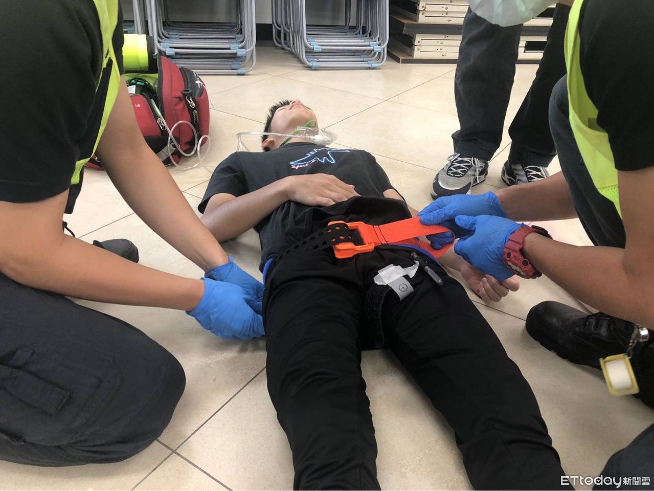 ▲新北男心情不好拿手捶玻璃,下秒噴血倒地,消防員緊急拿止血帶救了他。(示意圖/新北消防局提供)
