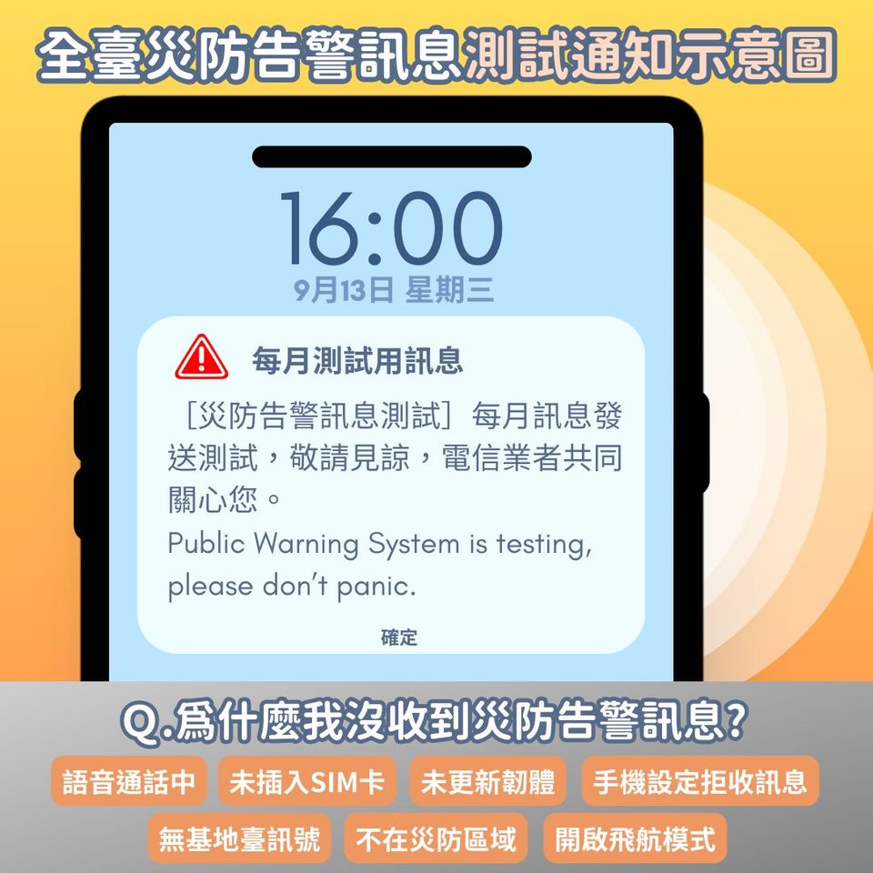 ▲今天下午4點進行災防告警訊息測試,6招解決收不到方法。(圖/翻攝自NCC)