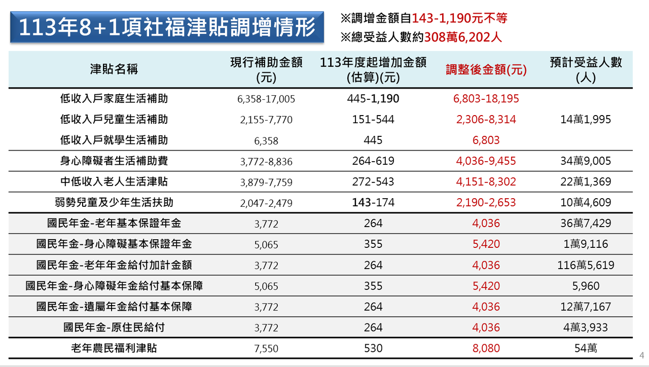 衛福部表示,低收入戶3項生活補助由現行每人每月2,155元至1萬7,005元,調整為每人每月2,306元至1萬8,195元;身心障礙者生活補助費每人每月由現行3,772元、5,065元、8,836元,調整為4,036元、5,420元、9,455元;中低收入老人生活津貼每人每月由3,879元、7,759元,調整為4,151元、8,302元;弱勢兒童及少年生活扶助每人每月由2,047元至2,479元,調整為2,190元至2,653元;國民年金老年年金給付加計金額、老年基本保證年金、遺屬年金給付及原住民給付每人每月由3,772元,調整為4,036元;身心障礙年金給付及身心障礙基本保證年金每人每月由5,065元調整為5,420元;老年農民福利津貼每人每月由7,550元調整為8,080元。
