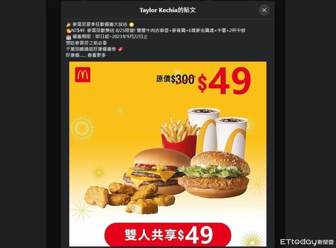 台中市民小雯本月初看見臉書跳出一頁式廣告,裡面有雙層牛肉吉事堡、麥香雞、6塊麥克雞塊、中薯、2杯中飲,是一份原價300元的雙人分享餐,優惠只要49元,她立即手刀下訂,跟著頁面指示,輸入名字、手機號碼、電子郵件後確認提交,再依據要求輸入信用卡號。