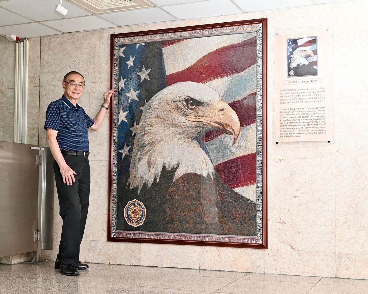馮世寬認為,既然想美化大廳,搭電梯旁的那面牆空著就顯得有點奇怪,而且愈看愈不順眼,正煩惱想不出個主意時,主任祕書簡世鋒自美參加退協總會的年會回來,帶來了總會長送他的禮物,大家把它打開,是一幅美國國鳥白頭鵰的羊毛掛毯,以為就是一幅老鷹掛毯,但拍出來的照片,那隻白頭鵰感覺卻是立體的。